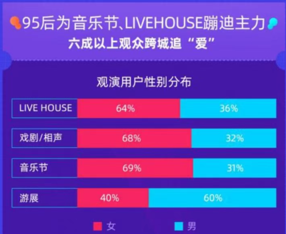 尤其是Livehouse、戏剧/相声、音乐节这三类,女性与男性观众比例逼近7:3。