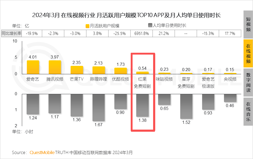数据比体感更诚实。根据QuestMobile的报告,字节跳动旗下的红果免费短剧App,2024年3月的月人均单日使用时长已达1.38小时——一个靠分发切片视频的后来者,在用户停留时长这个核心资产上,直接分食了长视频巨头们深耕十多年的腹地。