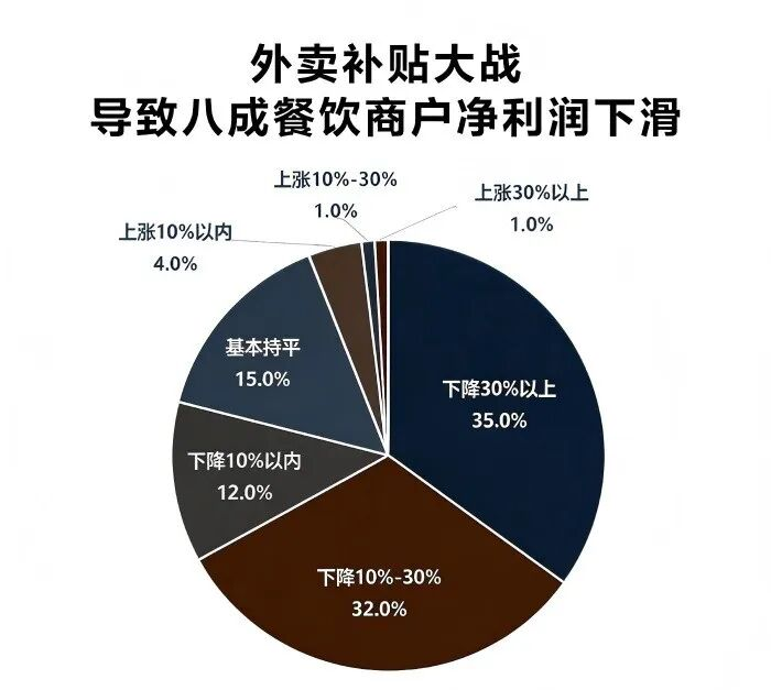 根据2月27日立信咨询发布的报告《从流量狂欢到利润下滑:“补贴大战”中餐饮商户的真实处境》,在其调查的近3000家商户中,近七成营业额出现下降,其中降幅超过20%的高达48%,近80%的商户净利润出现下滑,其中降幅超过30%的占35%。