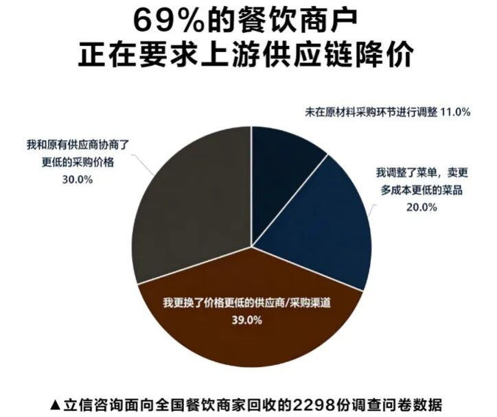 立信咨询报告也显示,面对价格内卷的压力,39%的商户开始更换价格更低廉的原材料供应商,20%的商户选择增加低成本菜品的占比,30%的商户强化与现有供应商的议价博弈。