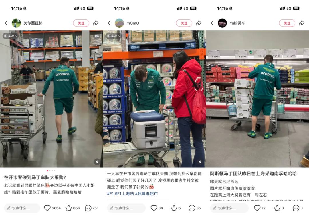 这些车手,也开始在中国获得了明星式的待遇。车手们在意大利餐馆吃饭、喝了阿嫲手作、在凯悦健身、去豫园玩,都被实时追踪,附上粉丝合影。甚至,连阿斯顿马丁车队去开市客采购,因为是第一支在上海公开穿制服出动的车队,都被360度偷拍。