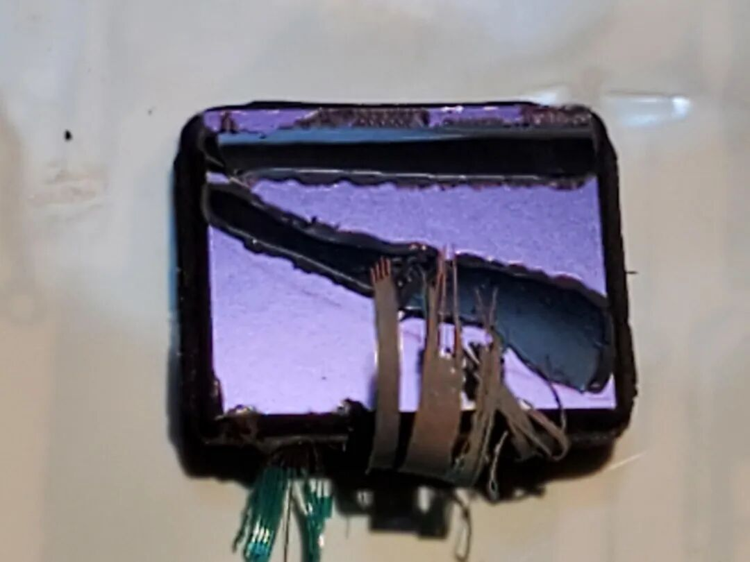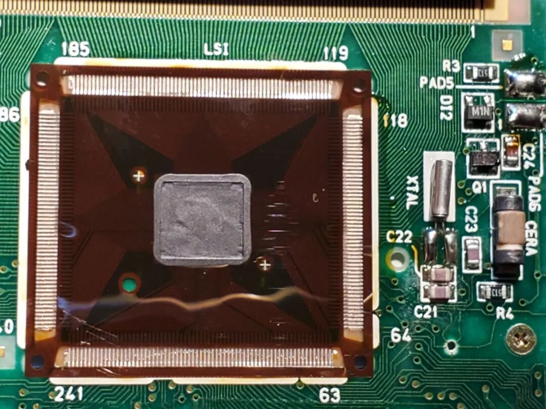 外面不包传统塑料外壳(像现代IC的黑方块),而是直接“滴”一层黑胶,这个方方正正、表面有点反光/蓝紫色虹彩的黑色块。