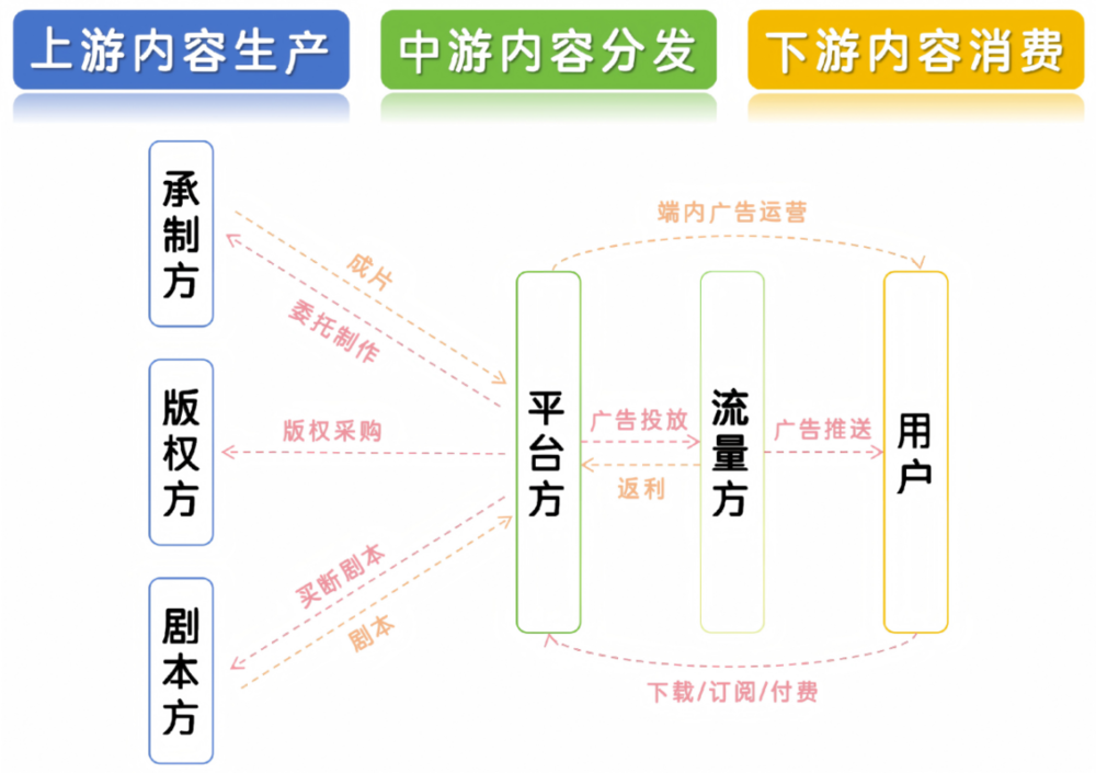 平台方承担了包括版权、制作、推广的大部分成本,并构建了变现闭环,成为最大的成本支出方和收益接收方。而版权方、剧本方、承制方、流量方则通过与平台方直接或间接合作获得利润分成或固定收入。