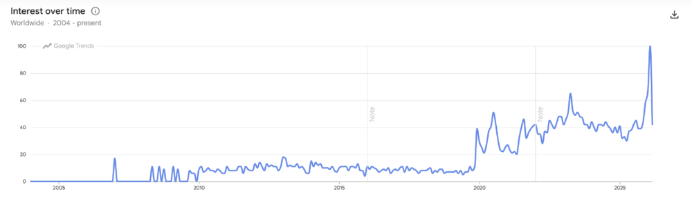 根据Google给出的关键词统计,有关它的搜索量在今年年初又杀了回来,甚至冲到了这二十年来的最高峰。