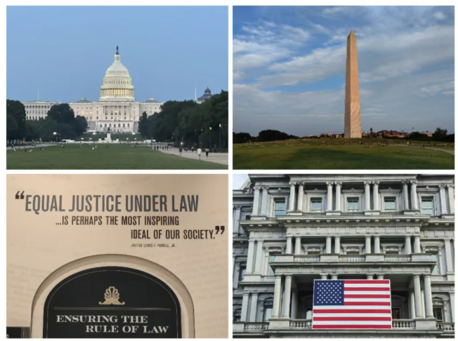国会大厦远景(左上)、最高法院内标语(左下)、华盛顿纪念塔(右上)、白宫外景(右下)