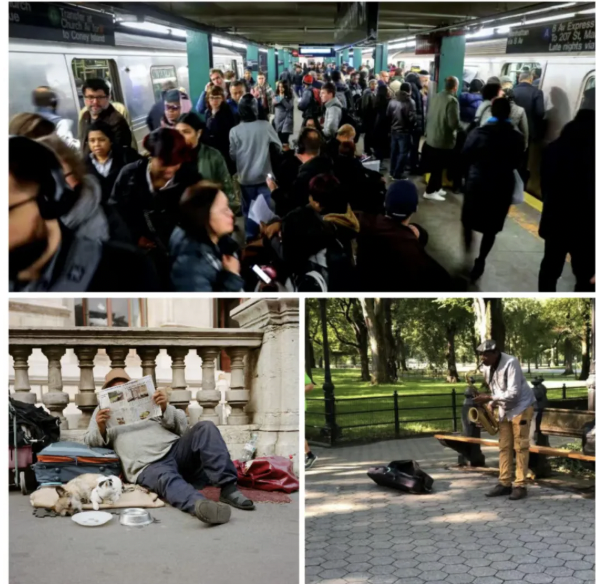 纽约地铁(上)、中央公园无家可归者(下左)和街头艺术家(下右)