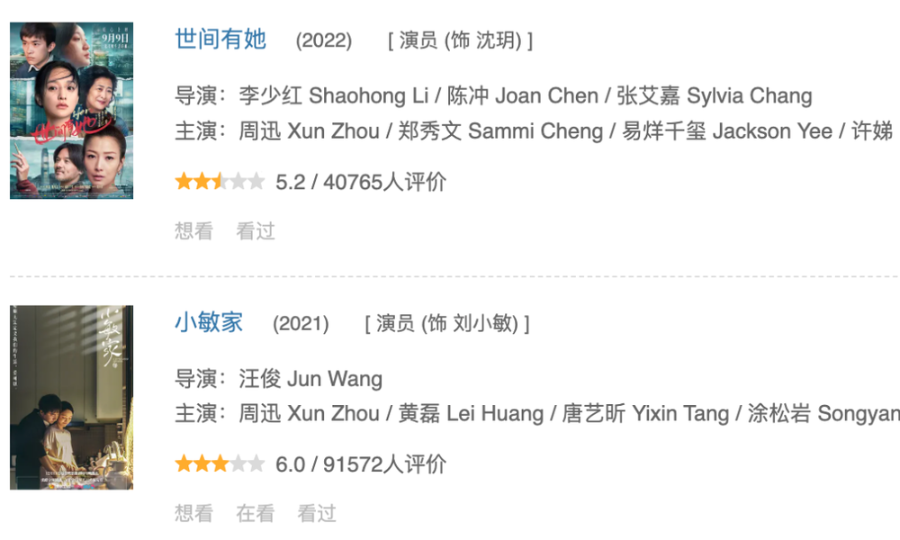 近5年,她主演了3部作品,豆瓣均分6.0,没有一部超过7分。