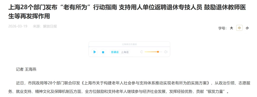 近日,市民政局等28个部门联合印发《上海市关于构建老年人社会参与支持体系推动实现老有所为的实施方案》。