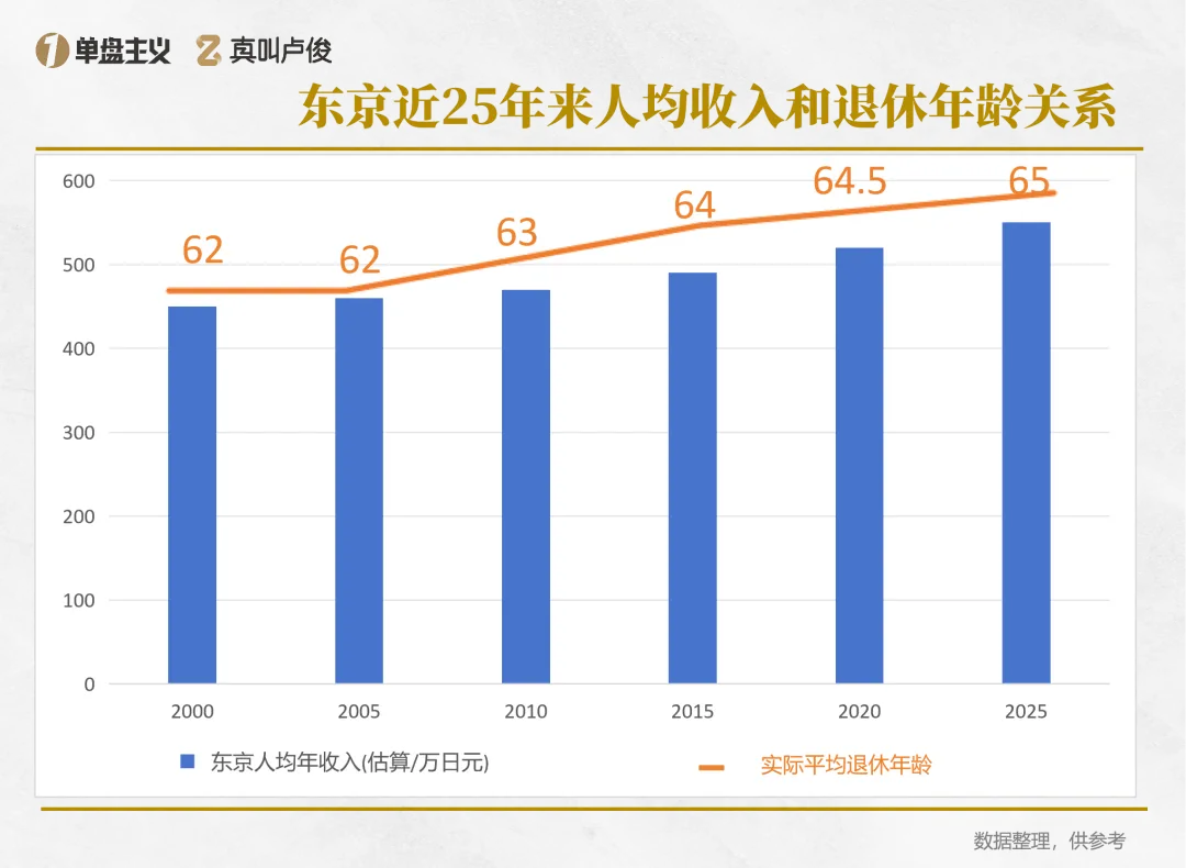 近25年,东京的人均收入和实际退休平均年龄呈正相关。