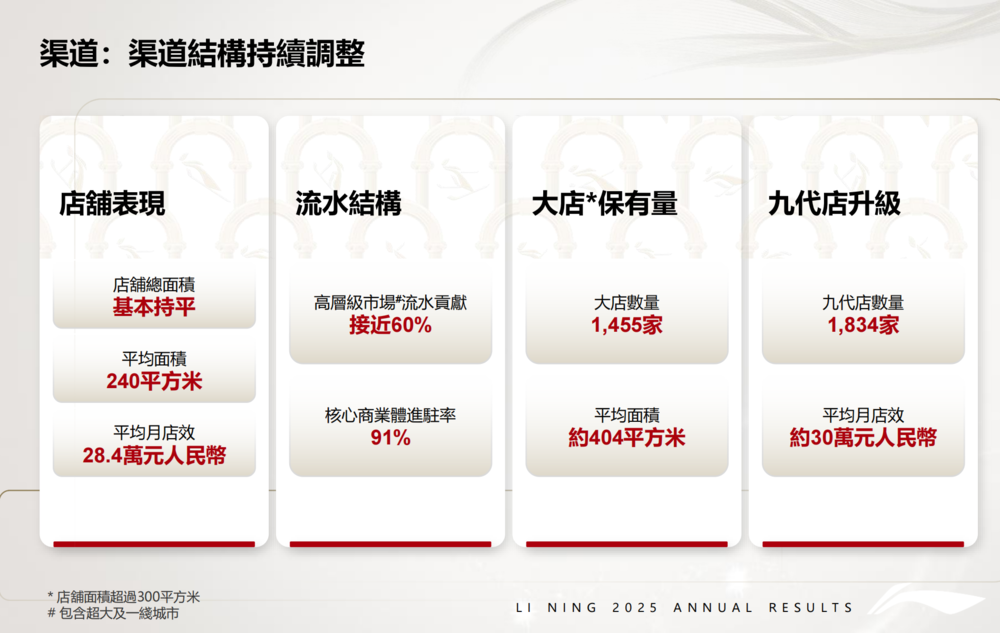 过去一两年李宁曾主动渠道“优化”,本质是一场“收缩与聚焦”:用短期门店数量的减少,赌长期单店盈利能力和品牌形象的提升。如果赌对了,将拥有一批更高效、更具品牌代表性的线下据点,形成更强的渠道护城河。