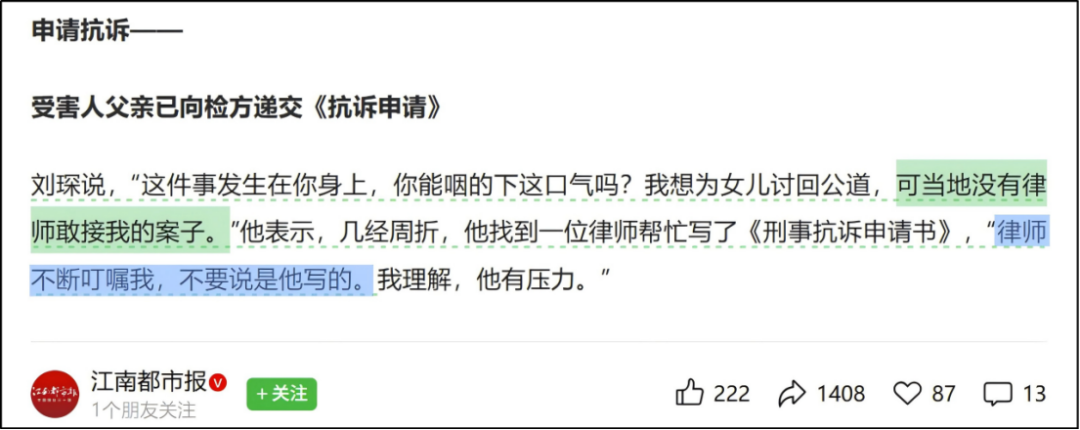 所以他们决定申请抗诉,但这不是首要问题,首要问题是小君爸爸说的:似乎没人敢接这案子。
