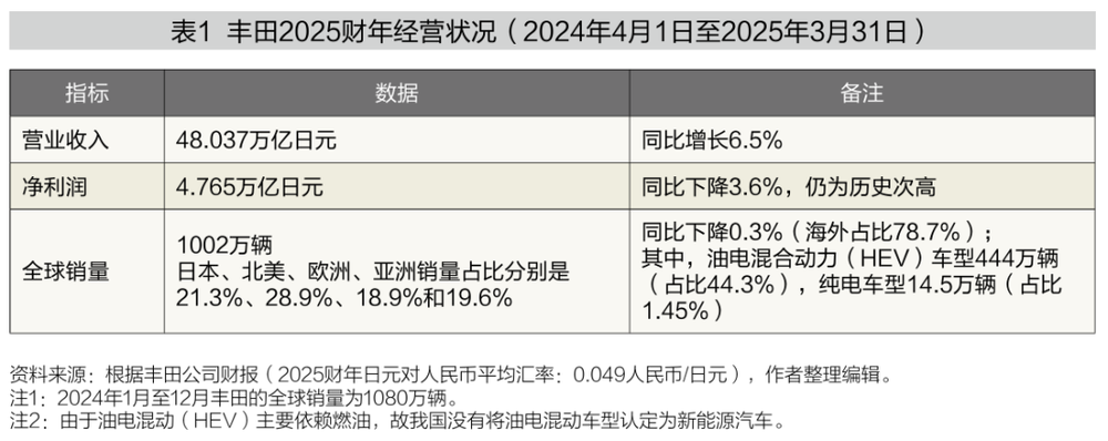 自1937年丰田汽车公司成立以来,其发展历程不仅反映了日本制造业的崛起,也体现了全球汽车行业的发展变迁。从早期借鉴美国车型到自主创新,丰田始终以“质量、效率、创新”为核心,逐步构建起覆盖研发、生产、营销的全球化体系。丰田汽车的发展过程可划分为四个阶段:第一阶段(1930—1957年)属于初创期,确立汽车生产体系的基础;第二阶段(1958—1980年)属于奠基期,汽车量产体系成型与技术突破并行,1980年销售量达507万辆;第三阶段(1981—2012年)属于扩张期,投入全球销售网络和海外生产基地的建设,2010年销售量达743万辆;第四阶段(2013至今)属于转型期,着力碳中和与智能化变革。丰田发展过程中的持续技术创新为丰田能长期处于行业前列奠定了深厚的根基。2025财年丰田销量达1002万辆,营业收入48万亿日元,为全球第一汽车制造企业(见表1)。