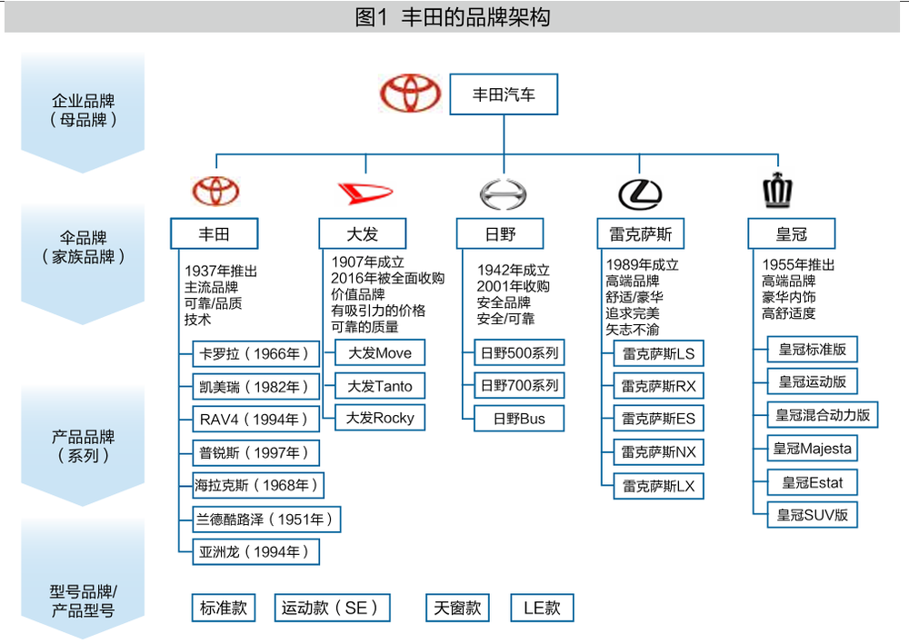 全球品牌建设。丰田凭借长期积淀的产品质量,构建了强大的全球品牌影响力。根据Interbrand2024年全球最佳品牌排行榜,丰田以728亿美元品牌价值位列第六,稳居全球最具价值汽车品牌之首。自20世纪70年代起,丰田在北美、欧洲、亚洲等市场逐步建立广泛认知,凭借可靠性与优质服务赢得全球消费者信任。其构建的多层次品牌体系精准覆盖不同消费群体(见图1):主品牌丰田聚焦大众市场,提供从经济型轿车到SUV、皮卡的全品类选择;高端品牌雷克萨斯专注高档车型,在欧美市场占据重要地位。通过多品牌战略,丰田成功覆盖了豪华与大众两大主流市场,并借助普锐斯等环保车型构筑了在绿色出行领域的持久品牌优势。