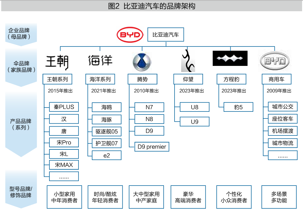 全球市场开拓与全球品牌建设启航。比亚迪的营销全球化虽起步较晚,但凭借新能源车与电池技术创新快速扩张。其始终以“科技、绿色、明天”为品牌核心形象,通过完整品牌体系覆盖全球市场(见图2)。2005年推出首款自主品牌轿车F3;2010年提出“城市公共交通电动化”战略,在全球推广新能源公交与出租车;2021年启动“乘用车出海”计划,首批100辆唐EV发运挪威,正式进军欧洲发达国家市场;2022年在东京召开品牌发布会,携ATTO3、海豚、海豹三款电动车进军日本乘用车市场;2023年陆续在泰国、马来西亚、印度等东南亚及南亚国家推出乘用车,进一步扩大覆盖。2024年,比亚迪新能源乘用车海外销量达43.3万辆,同比增长78.2%,出口占比从2018年的2.0%升至10.1%;截至2025年5月,乘用车已进入全球100多个国家和地区。