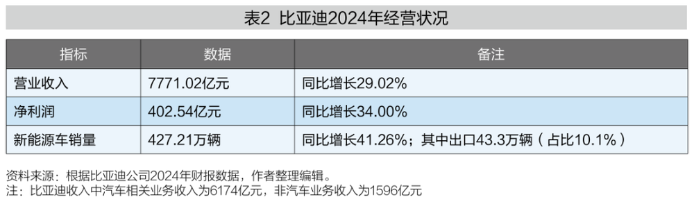 比亚迪1995年于深圳创立,从电池制造起步,依托中国新能源政策支持,逐渐发展为新能源汽车行业的全球领军企业,依靠其在电池技术和电动车研发上的持续深耕,推动了新能源汽车行业的创新与发展,也实现了企业的快速成长。比亚迪的发展历程也可以分为四个阶段:第一阶段(1995—2002年)属于起家阶段,立足电池制造,布局手机供应链;第二阶段(2003—2009年)属于入局汽车产业阶段,跨界开启汽车制造,试水新能源汽车,于2005年推出首款新能源汽车F3;第三阶段(2010—2020年)属于深耕阶段,形成全链自控的新能源汽车量产体系,销售量于2020年达43万辆;第四阶段(2021至今)属于快速扩展阶段,着力于全球市场开拓与智能化高端化突破。2022年,比亚迪全面停止燃油车生产,2024年新能源汽车销量达427万辆(见表2),其中海外销量突破43.3万辆。到2025年5月,比亚迪已在全球100多个国家和地区开展业务。