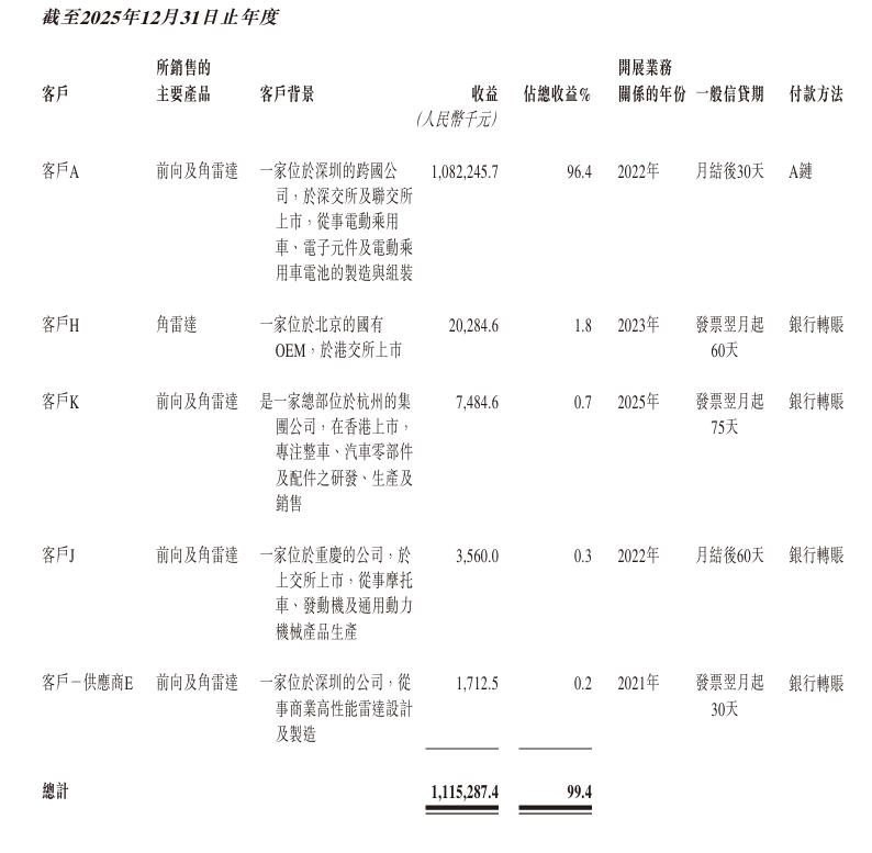 而这场增长神话的核心引擎,正是比亚迪。承泰科技是比亚迪毫米波雷达的主要供应商之一,产品已搭载于比亚迪汉、唐、宋等主力车型。证券时报同样确认,凭借过硬的产品和快速的交付,承泰科技2022年成功进入比亚迪供应链,成为其核心毫米波雷达供应商。招股书显示,公司来自最大客户“客户A”的收入占比,从2023年的91.3%攀升至2025年的96.4%——这意味着,承泰科技的命运几乎完全系于比亚迪一家的兴衰。