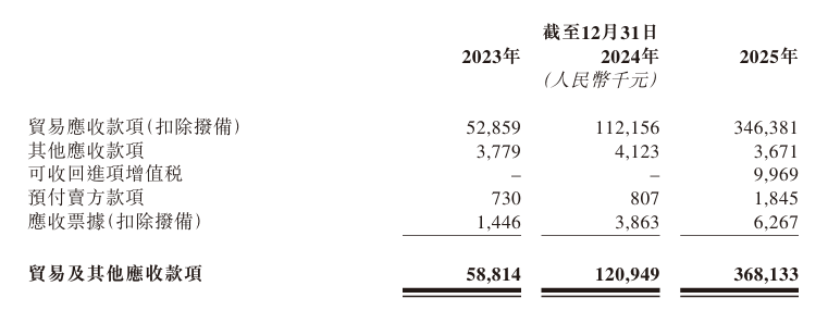 这种极致依赖带来了严重的现金流压力。随着营收暴增,公司的贸易应收款项从2023年的5290万元飙升至2025年的3.46亿元。更关键的是,客户在结算时大量使用“A链凭证”这类供应链金融工具。招股书明确指出,这种结算方式“将流动性风险和高昂的贴现成本直接转嫁给了供应商”。2025年,涉及此类凭证的应收款高达1.59亿元。