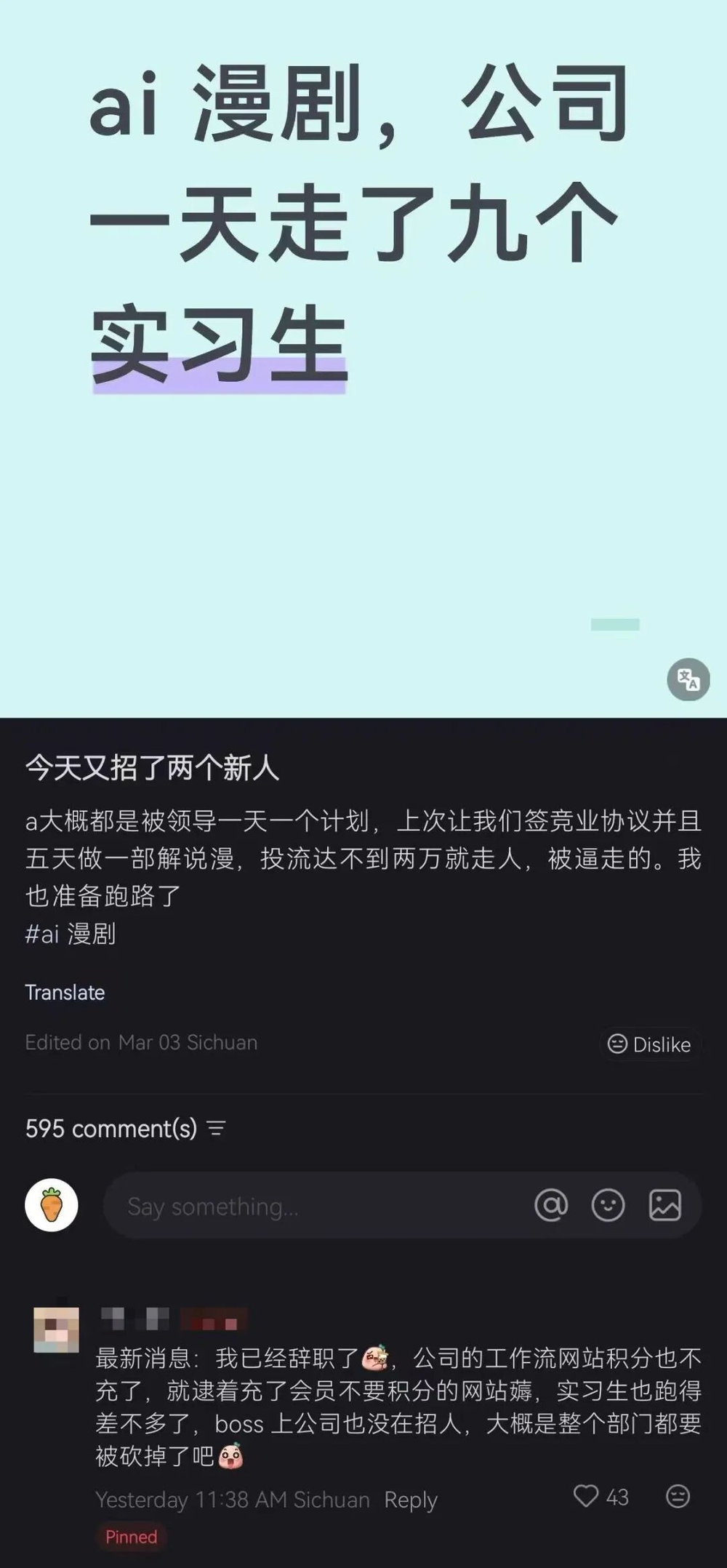 在小红书上,有实习生吐槽自己被某承制公司要求签署竞业协议,五天做一部解说漫,投流达不到两万就走人。