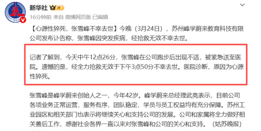 据新华社等报道披露,离世前张雪峰曾在公司跑步锻炼,而后出现不适被紧急送往医院。