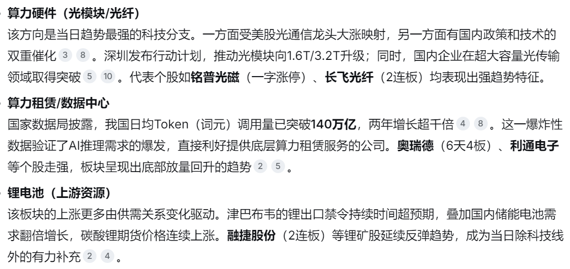 趋势股的上涨主要由产业趋势和业绩预期驱动。AI从“训练”向“推理”的演进,带来了算力基础设施(光模块、算力租赁)需求的确定性增长;而锂电板块则受益于上游资源品的供给收缩和下游需求的超预期。