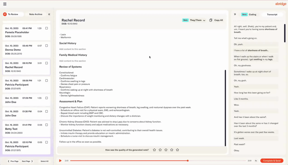 在美国,看诊 1 小时,写病历 2 小时。很多医生下班后还要在家补笔记,这段时间被叫做“睡衣时间”。Abridge 做的事,就是把这 2 小时还给医生,医生和患者聊完天,几秒钟自动生成一份结构化病历笔记。