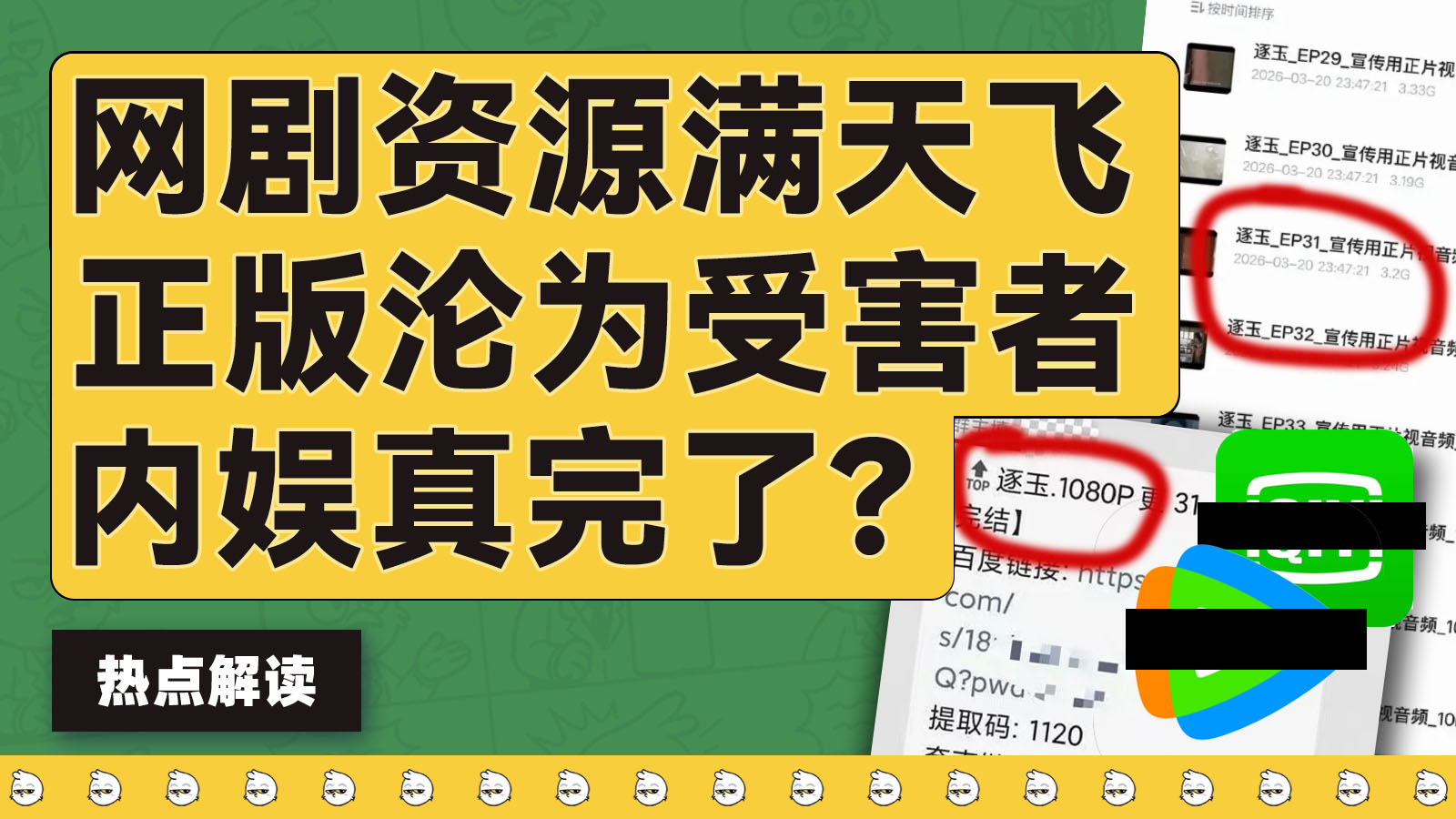 《逐玉》正片还没播完,盗版资源就已经满天飞,不少人提前把结局都给看了。是视频平台故意泄露?还是影视公司有内鬼?我们这些买了会员的,却最终成了“正版受害者”,被割韭菜了?你或许也注意到了,最近几年虽然大家都在支持正版,但是盗版资源大有回潮的趋势。所以这期视频我们来回答这些问题:为什么盗版资源这两年卷土重来?为什么出现越来越多的内部泄漏事件?然后顺带估算一下,这次资源泄漏事件让腾讯和爱奇艺亏损了多少钱?