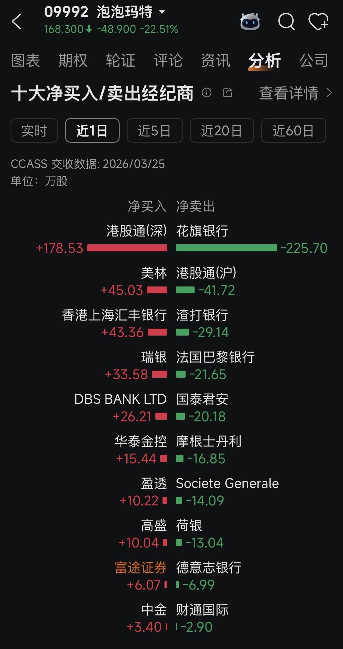 在泡泡玛特25日的前十交易名单上的卖出方几乎都是外资机构,如花旗、渣打、摩根士丹利、等外资大行;买入方主要是富途证券、中金等。所以,内地南向资金仍然是看多头寸的主要来源,而外资对冲基金是主要的看空头寸来源。