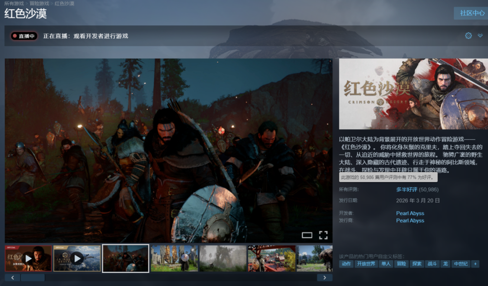 第三天之后,《红色沙漠》的评价迎来强势反转,最高在线人数也水涨船高,迎来反弹。截止目前,Steam的总评价从最初的多半差评上升到多半好评(77%好评),就连一向挑剔的国区玩家,也给出了不少积极反馈,好评率从34%一路拉升到60%。目前,最高在线人数依旧在20万左右,畅销榜稳定在TOP 2前列。