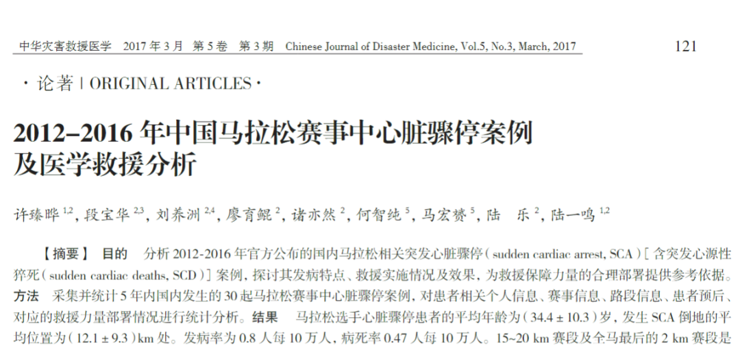 [4] 许臻晔,段宝华,刘养洲,廖育鲲,诸亦然,何智纯,马宏赟,陆乐,陆一鸣.2012-2016年中国马拉松赛事中心脏骤停案例及医学救援分析[J].中华灾害救援医学,2017,5(3):121-126.DOI:10.13919/j.issn.2095-6274.2017.03.001