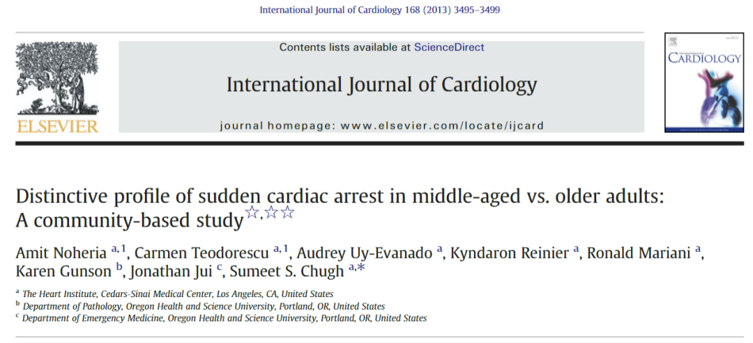 [6] Noheria, A., Teodorescu, C., Uy-Evanado, A., Reinier, K., Mariani, R., Gunson, K., Jui, J., & Chugh, S. S. (2013). Distinctive profile of sudden cardiac arrest in middle-aged vs. older adults: a community-based study. International journal of cardiology, 168(4), 3495–3499. https://doi.org/10.1016/j.ijcard.2013.04.207
