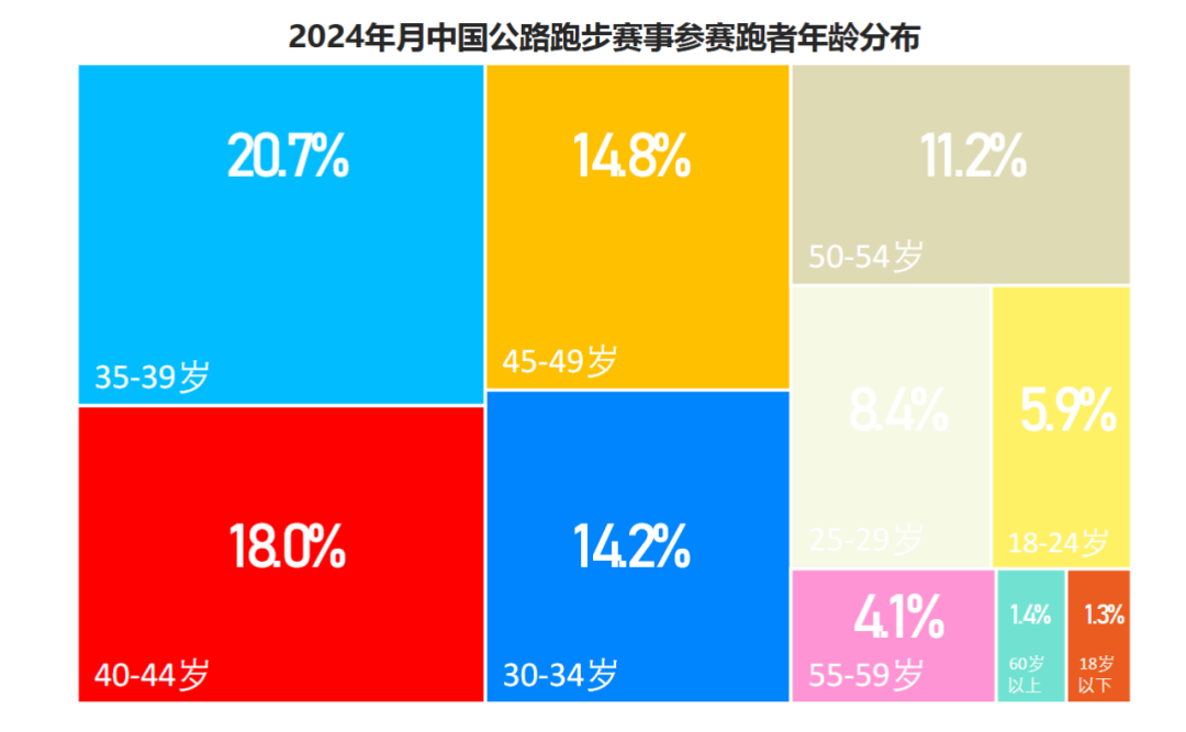 在极数发布的《中国公路跑步赛事白皮书2025》中,给出了这么一组有趣的人群画像:最多的人群为35~39岁占20.7%,40~44岁占18%,45~49岁占14.8%,50~54岁占11.2%,55~59岁占4.1%;