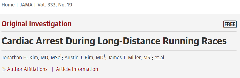 [8] Kim JH, Rim AJ, Miller JT, et al. Cardiac Arrest During Long-Distance Running Races. JAMA. 2025;333(19):1699–1707. doi:10.1001/jama.2025.3026