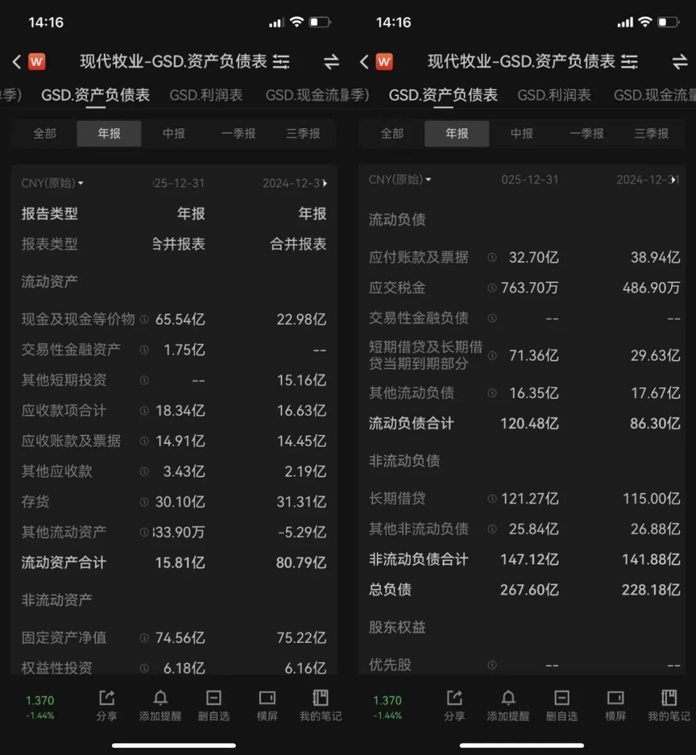 Wind显示,报告期内,现代牧业流动负债(一年内到期)合计120.48亿元,同比增长39.61%;截至2025年12月31日,其现金及现金等价物为65.54亿元,现金短债比小于1,这表示现金储备不足以覆盖一年内到期的流动负债,短期偿债压力较大。