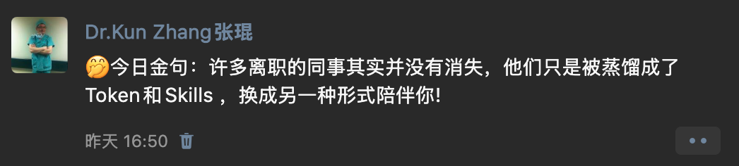 “许多离职的同事其实并没有消失。他们只是被蒸馏成了Token和Skills,换成了另一种形式,在云端继续陪伴你!”