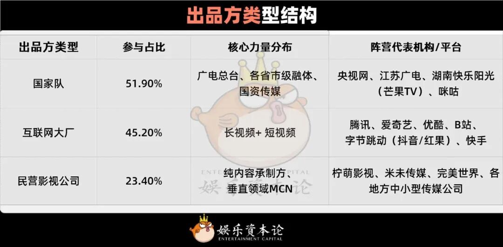 好内容离不开好推手。当娱乐资本论穿透这近397部作品背后的出品方结构时,一幅“国企+大厂+民营”协同作战的生动图景跃然纸上。