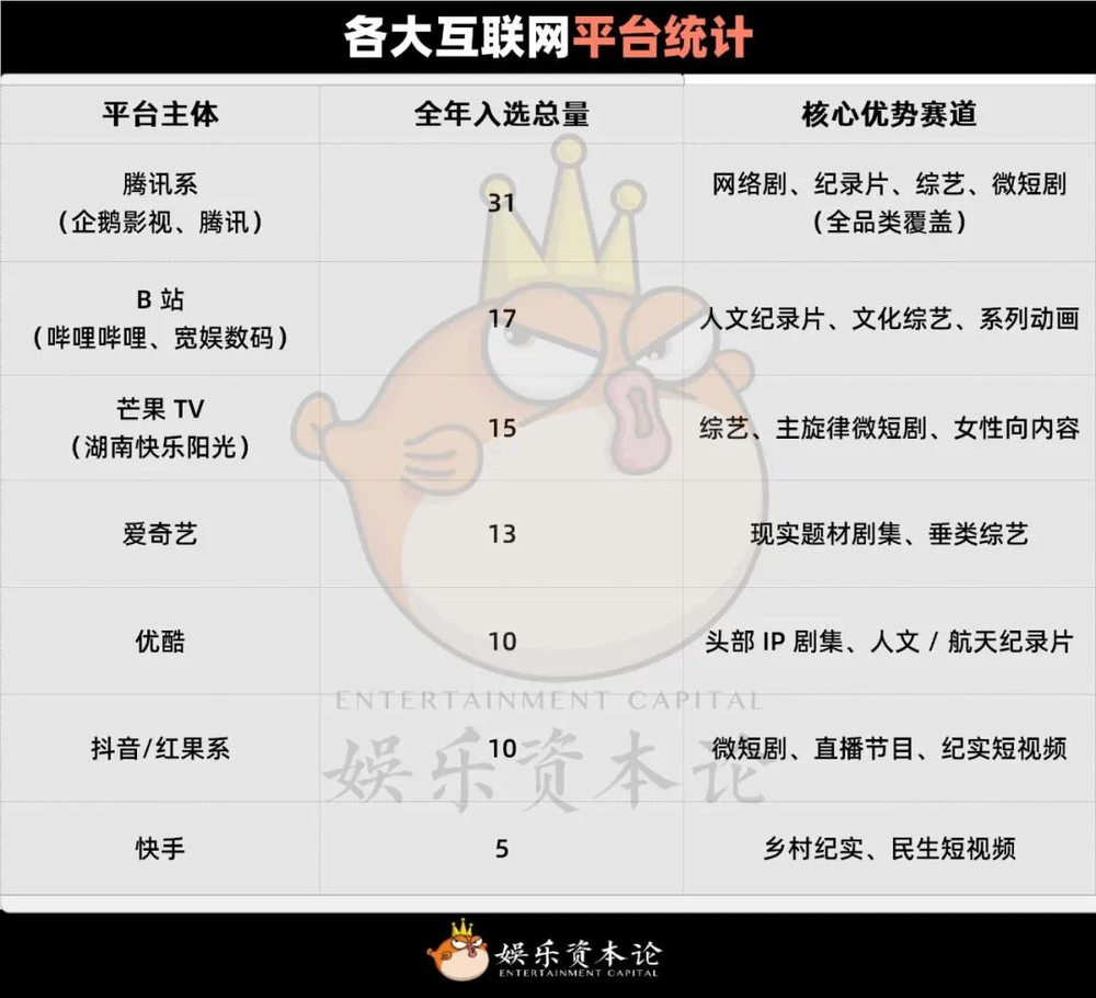 长视频御三家(爱优腾)依然是高品质剧集和大型综艺的造梦者,持续输出着极具商业价值与社会意义的头部IP。其中腾讯系(企鹅影视、腾讯)全年入选31部,全品类覆盖了网络剧、纪录片、综艺、微短剧等赛道,证明了深厚的实力。
