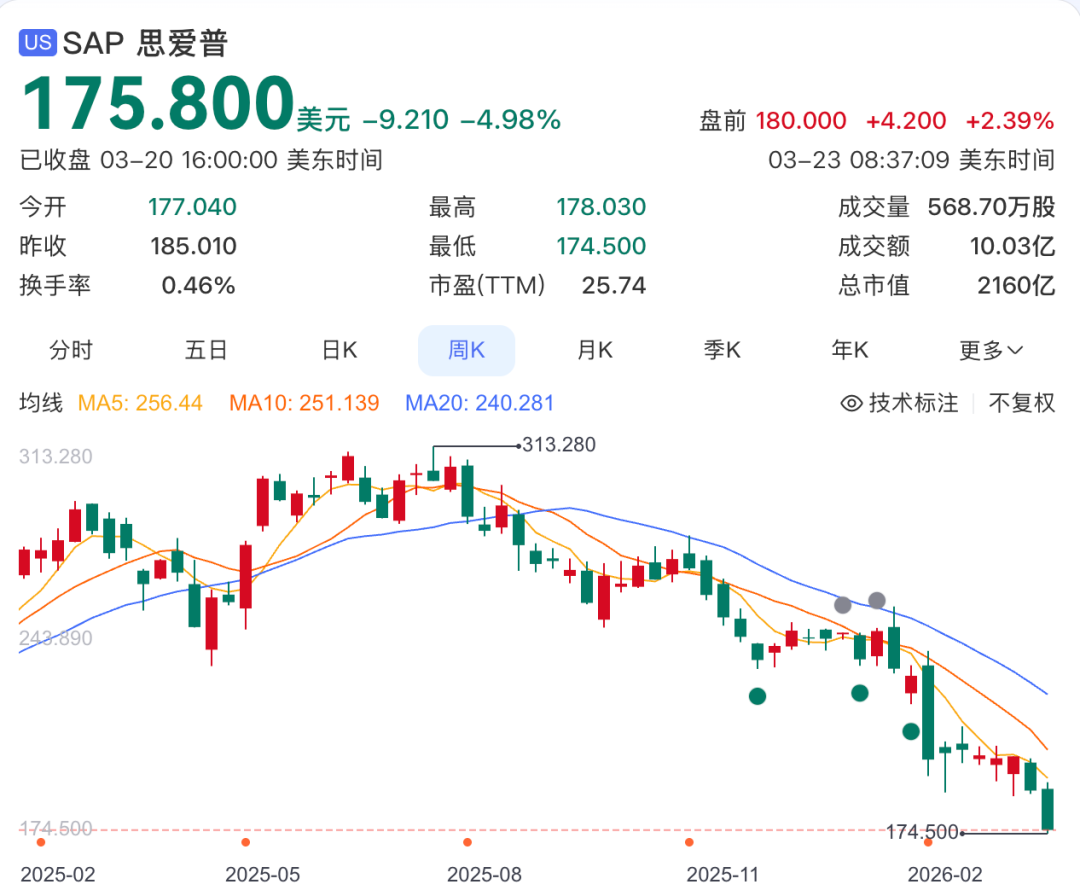 从去年7月起,SAP的股价就一路下行,截止到目前,已经累计下跌超过40%,目前还看不到止跌的迹象。