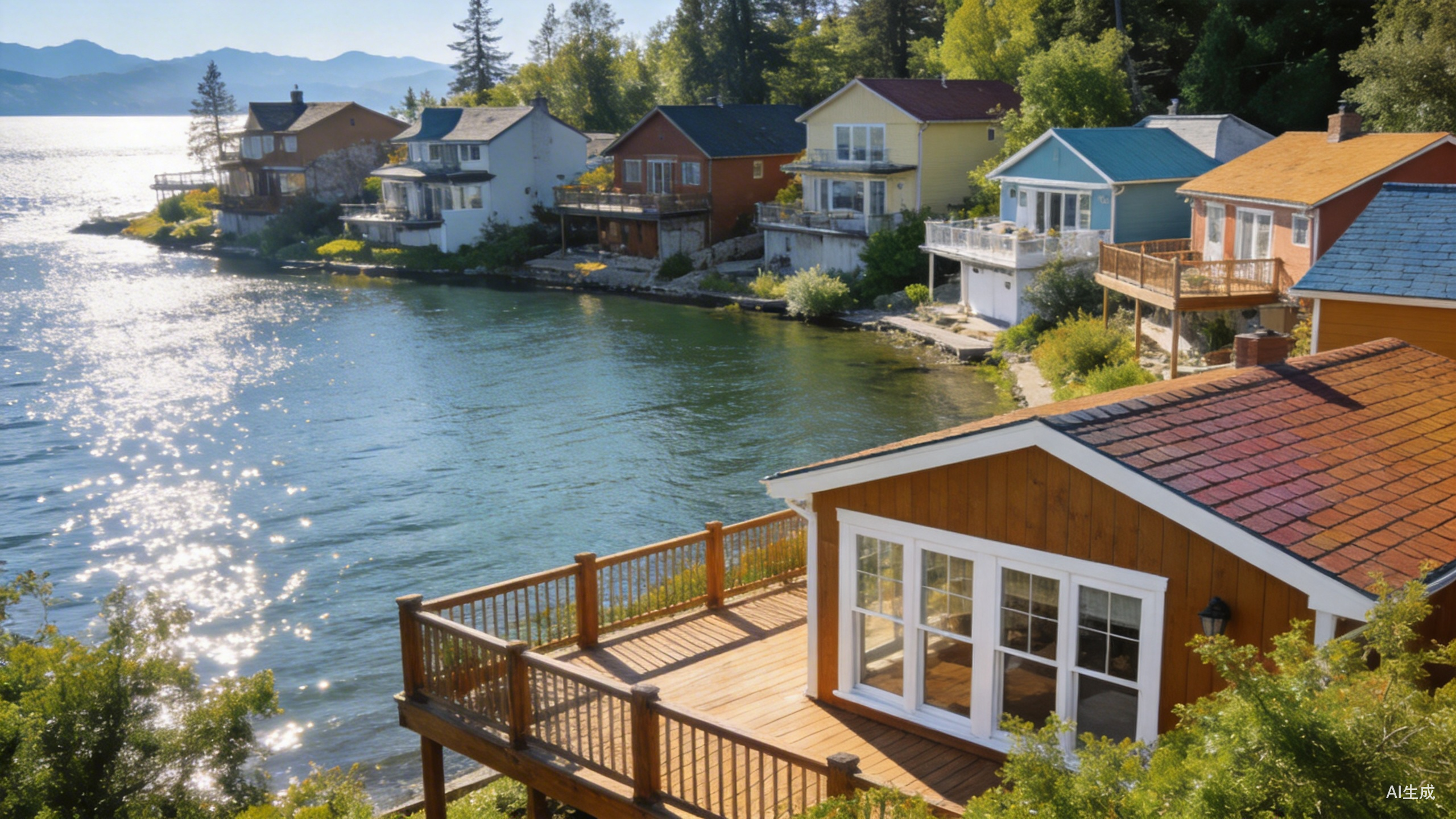 该住宅为多层不规则坡顶木屋,整体形态错落扭曲,没有规整的几何轮廓,多个大小不一的坡顶相互叠加,右侧还带有向外倾斜的悬挑结构,视觉上充满动态与野性,仿佛自然生长出来一般。建筑依水而建,底部直接贴近河岸,与自然环境高度融合。外墙以黑色垂直木护板为主,木材表面带着岁月的烟熏与风化痕迹,呈现出深沉质朴的质感;右侧局部区域采用了红棕色木板,与黑色墙面形成强烈色彩对比。