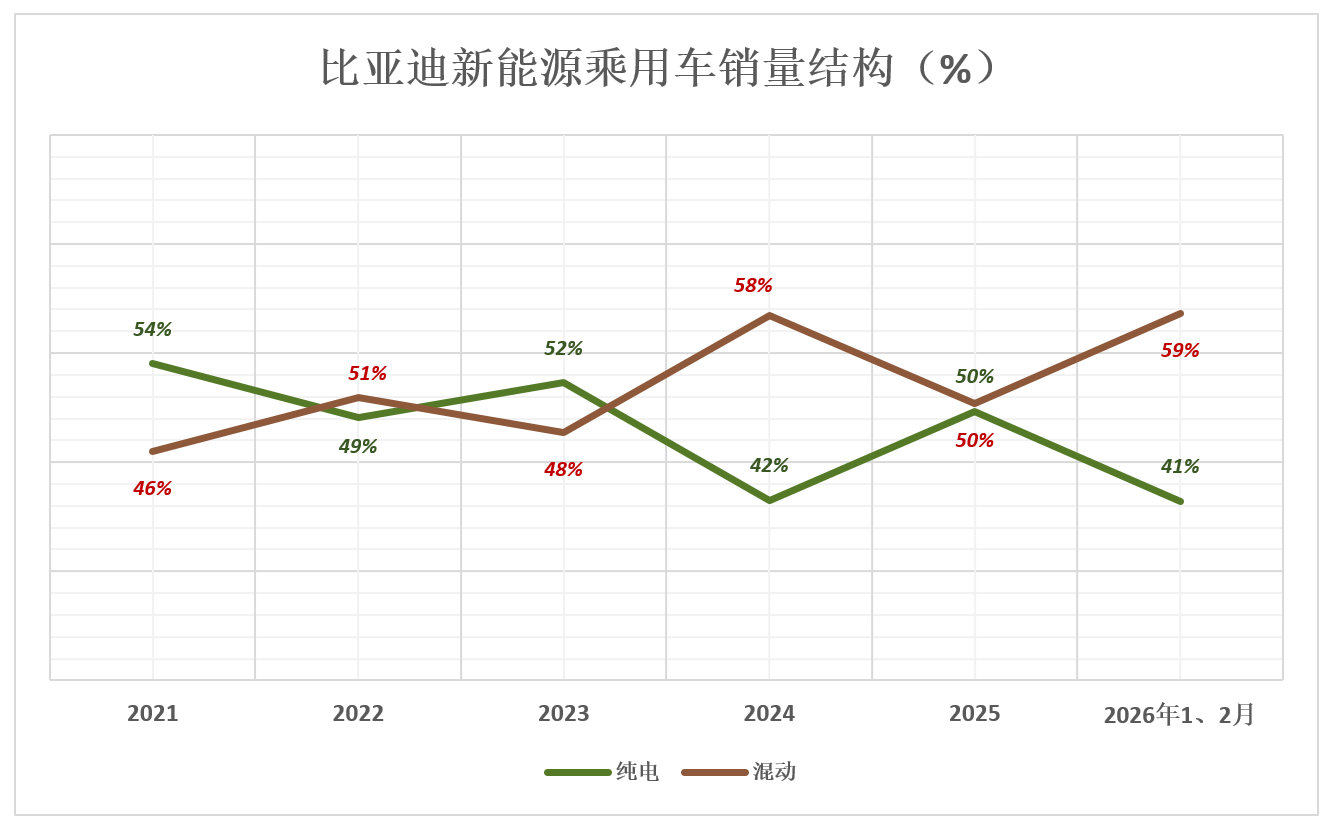 2026年前两个月,比亚迪销量同比大幅下跌。其中,纯电动车销量下降35%、插混车销量下降36.7%,两条腿齐步走失效了吗?