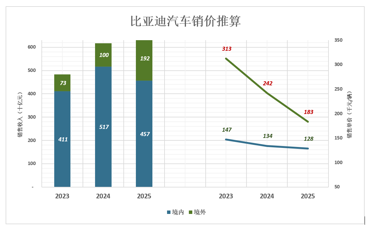 比亚迪汽车境内销售均价12.8万元/辆,境外销售均价18.3万元/辆(此为粗略推算);
