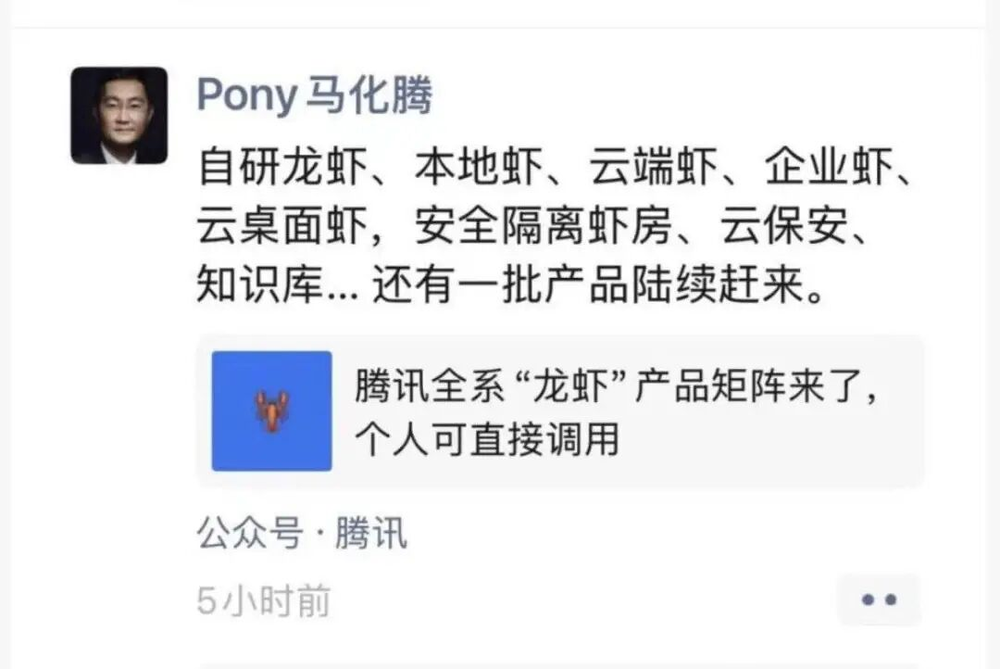 3月11日凌晨2:06,马化腾发了条朋友圈:「自研龙虾、本地虾、云端虾、企业虾、云桌面虾,安全隔离虾房、云保安、知识库……还有一批产品陆续赶来。」