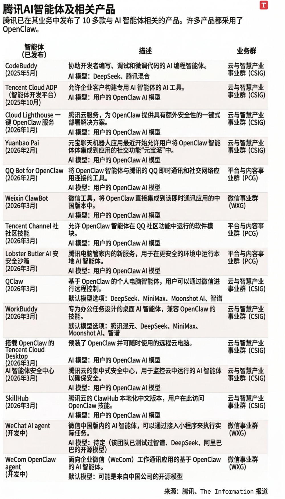 据The Information报道,截至本月,腾讯内部同时有8个团队在开发基于OpenClaw的产品和服务。加上在研和内测项目,总数已超过10个。
