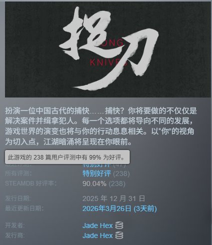 尽管游戏内容目前还没有完全上线,已有的五个章节大概只需要几个小时时间就能体验一遍,但它已经在Steam上获得了99%的好评率——而且,《捉刀》还是完全免费的。