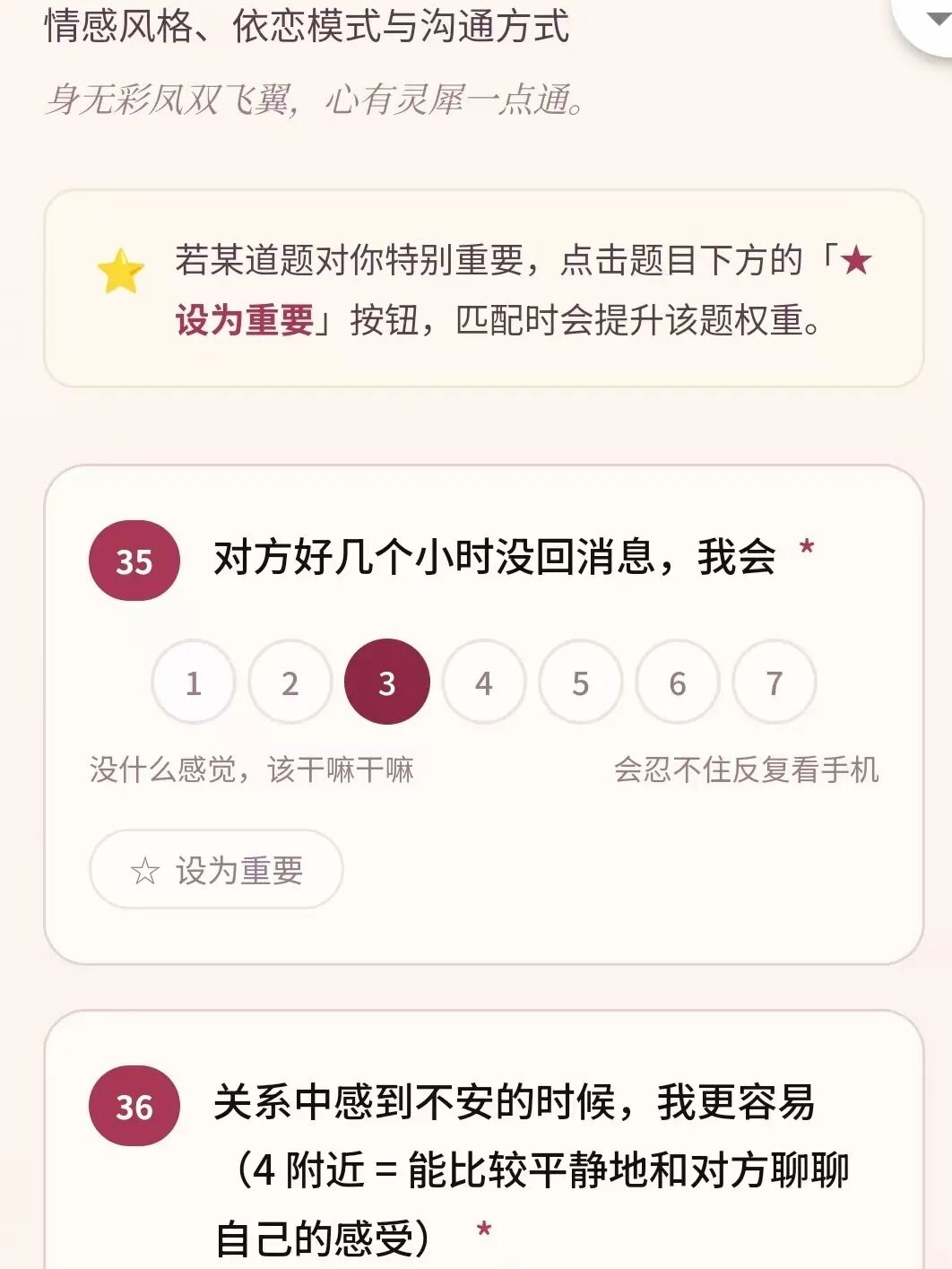 FDU Date平台创始人之衡提及,系统会从多个维度评估两个人的兼容性:“对方是否具备你想要的品质、两人日常相处合不合拍,一些方面是否适度互补。”同时,问卷中的大部分题目都可以被标记为“对我很重要”,系统会据此动态调整权重,让匹配结果更贴合用户真正关心的维度。