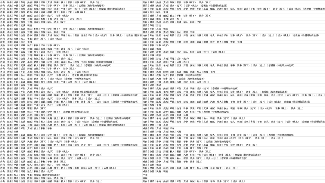 另一位月老张若宁介绍,问卷里,个体被简单地描述为“细腻”“单纯”“冷静”“风趣”“话多(线上/下)”“话少(线上/下)等类型。这些自我评价式的问题被月老们一一标注,用不同颜色做出记号,红色区域为成功区,绿色区域为待定区,如若缺乏适配的匹配对象,便会重新流入匹配池。一格格名字在“选中—退回—再挑选”的循环里反复移动。
