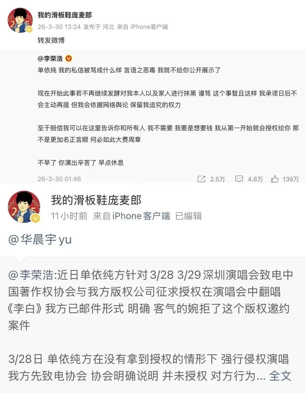 但李荣浩不一样,他没授权单依纯在演唱会上唱《李白》,结果人家还是翻唱了。他要维权,公开声讨,然后被骂。