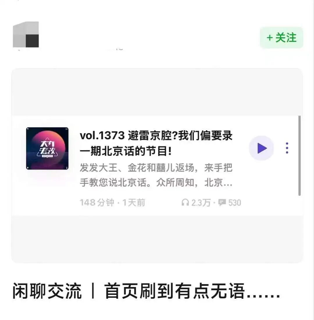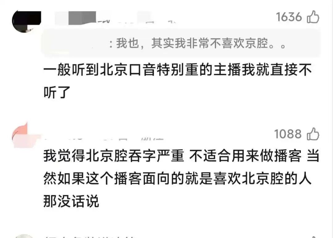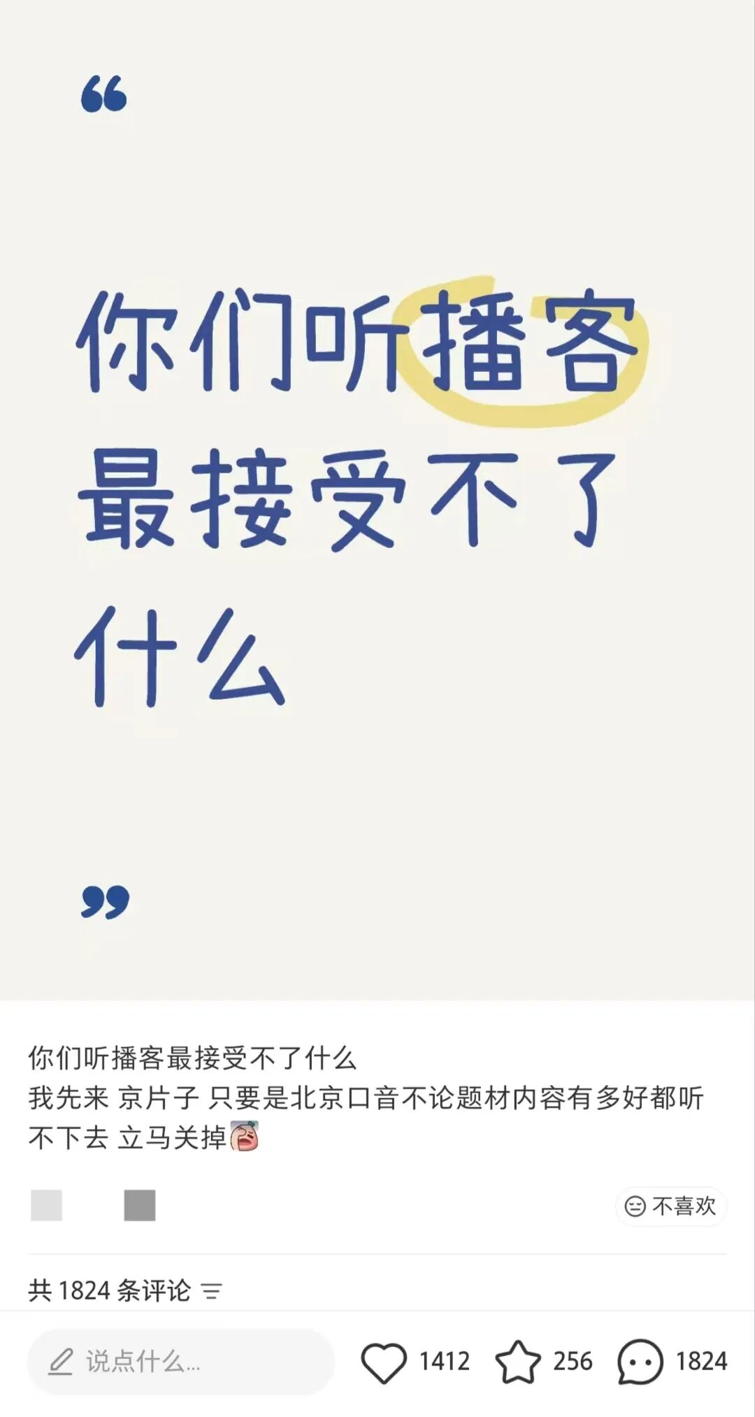 作为一个比较早听播客的人,一开始看到这种避雷贴,尤其是吐槽京腔的(很多其他北方地区的口音也会被误以为是京腔),有点诧异,因为最开始听的节目基本都是北京的,对这些主播都有很深的感情,从来没觉得北京口音是个问题。那个时期听播客的人很少,播客影响力不大,接受不了口音的人不会专门发帖避雷,顶多就是留个差评之后再也不听播客了(甚至很长一段时间播客是没有评论区的)。