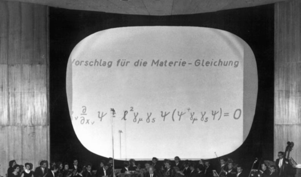 ▲1958年,维尔纳・海森堡在西柏林举办的马克斯・普朗克百年诞辰庆典上,展示他的“世界公式”(马普科学史所)