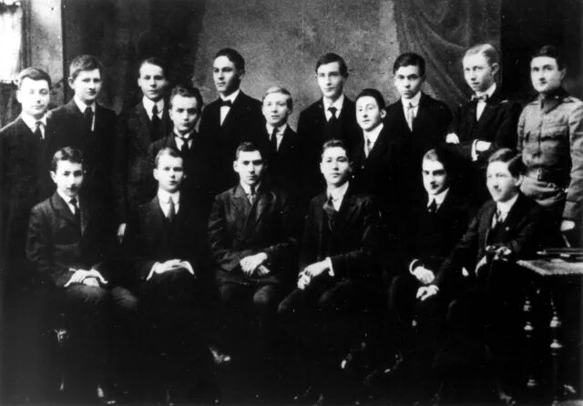 ▲1918年,泡利(二排左一)的天才班级,理查德·库恩获得了1938年诺贝尔化学奖,除此之外还有两位著名演员,一位音乐指挥家,三位大学教授,两位医学院院长,一位政治家和多位实业家(CERN)