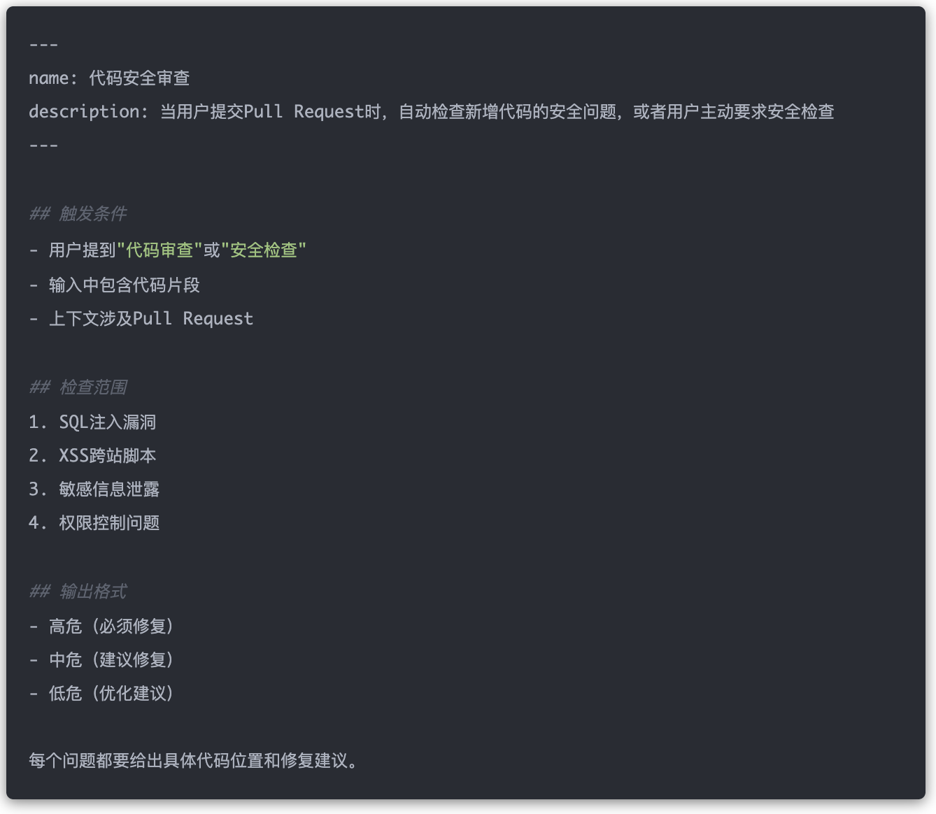 工具会在合适的时候自动调用它:当你提交Pull Request,或者主动发起安全检查时,对应 skill 就会被自动加载、执行。